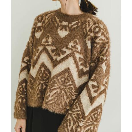 ふわふわとした毛足が特徴のフェザー素材で仕立てたシーズンムード高まるニット。パッと目を引く大胆なジャガード柄が、スタイリングを一気に華やかにしてくれます。大人っぽさ漂うコンパクト丈がスタイルアップ効果も発揮してくれますよ♪