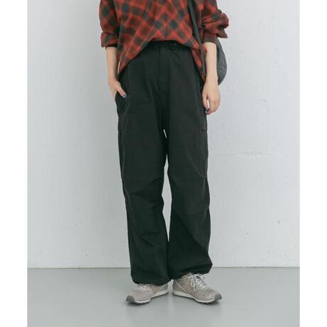 経糸と緯糸で異なる番手を使用したコットンの高密度ポプリン素材を使用したことでタフな風合いと軽い着心地に優れた生地に仕上がっています。本格的なパラシュートパンツのディティールを取り入れてますが丸いシルエットで柔らかさもあり、今っぽい抜け感を出せる、程よくルーズなデザインになっています。膝周りのタックディテールが立体感があるのと裾紐を絞り、裾幅に変化を加えることでカジュアルながら、女性らしさも演出してくれます。コンパクトなシルエットのトップスやあえてフェミニンなブラウスなどを合わせてもおすすめです。