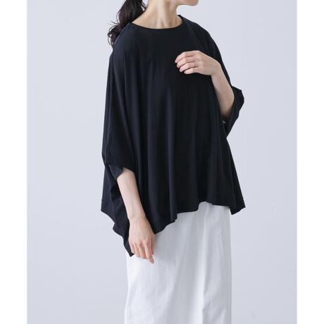 ワイドシルエットで涼しく、ポンチョのようなデザインが薄着の季節にこなれたムードを添える1枚。見た目にも涼しい穏やかな透け感にも注目です。生地はガス焼きの工程を入れることでクリアな表面に仕上がっています。細い繊維を強撚にし、肌離れのいいドライタッチな風合いがポイント。綿100%ながらもキックバックがありストレスフリーな着心地です。