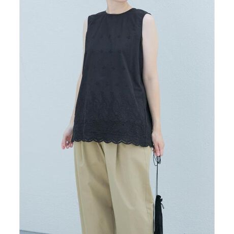 スカラップ刺繍がポイントのトップスが届きました。同系色の糸を使用しているので柄が派手になりすぎず着やすいです。デニムなどカジュアルなボトムを合わせるだけで簡単にスタイリングが完成。バックネックにゴムが入っているので、着脱がしやすい仕様もポイント。どこかきちんと感のあるコンパクトなクルーネックも品のある雰囲気を後押し。ノースリーブなのでカーディガンやストールを合わせる着こなしも素敵ですよ。同素材でパンツもご用意しています。