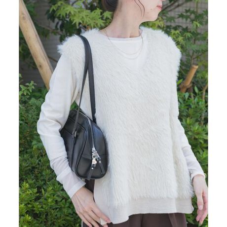 フロントはシャギー、バックはあぜ編みの異素材デザインが魅力のベスト。長めの丈感で腰回りをしっかりカバーし、安心感のあるデザインです。シャツやカットソーと重ねて、レイヤードスタイルを楽しめるのもポイント。シーズンムードを高める、着回し力の高いアイテムです。