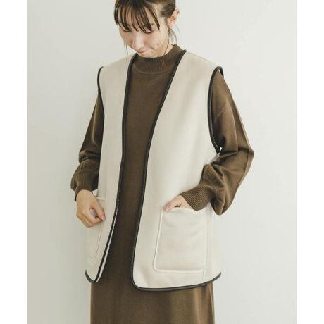 もこもことしたボア生地にパイピングデザインを加えてメリハリのあるディテールに仕立てたベスト。裏返せばフェイクムートン生地のベストとしても着用可能な2WAYデザインが一番の魅力!1着で2タイプの着こなしが叶うオススメアイテムです。ゆったりとしたシルエットなので、厚手のスウェットやニットとも好相性◎大きめのオープンポケットがどちらを表にしても施されているので、スマートフォンや鍵などの小物をサッと収納できる便利さもポイントです。