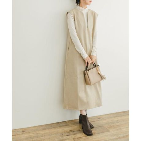 毎年好評の、とろみのあるフェイクスエード素材のジャンパースカートが今年も再登場!シンプルなボックスシルエットながら、スキッパーデザインとバックスリットが全体の印象を軽く見せてくれる1着。Tシャツ・カットソーからニットへとレイヤードするインナーを変えることで、ロングシーズンご着用いただけるオススメアイテムです。