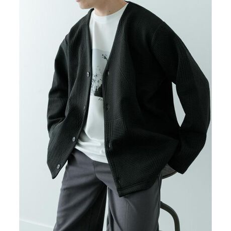 ジオメトリック柄ながら、同系色でまとめることで主張し過ぎず、程よいアクセントでコーディネートをまとめてくれます。