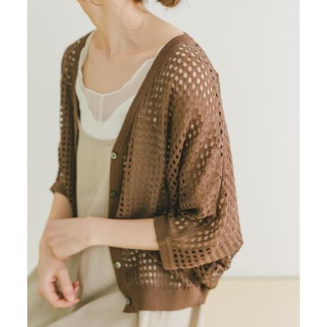 通気性の良いメッシュ編みで、暑い季節でもさらっと羽織れるカーディガン。前を開けても閉めてもバランスよく決まり、着こなしに合わせたアレンジが楽しめます。また、裾はリブ仕様になっておりコンパクトなシルエットで、ワンピースやワイドパンツにもバランスよく合わせられます。しわも気になりにくいので冷房対策やちょっとした外出時の羽織りにも活躍する、これからの時期に持っていたい、便利な一着です。