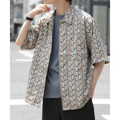 落ち着いたトーンのリーフ柄が、派手すぎず上品な印象を与えるオープンカラーシャツ。