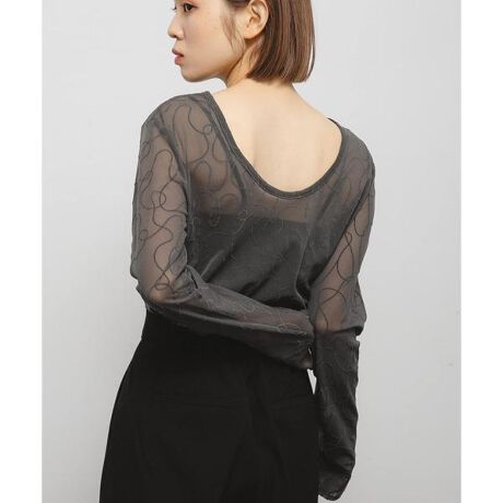 立体的なフロッキーデザインがアクセントになった、程よい透け感がヘルシーなシアートップス。フロッキー部分は表地と同色なので主張しすぎず、幅広い方に着ていただけます。メイン使いのみならず、インナーとしても重宝する1着です。