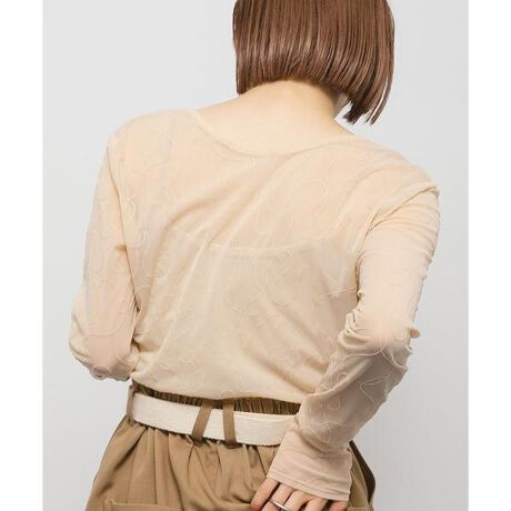 立体的なフロッキーデザインがアクセントになった、程よい透け感がヘルシーなシアートップス。フロッキー部分は表地と同色なので主張しすぎず、幅広い方に着ていただけます。メイン使いのみならず、インナーとしても重宝する1着です。