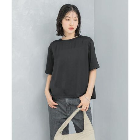 さりげない光沢感が上品な印象を演出するサテンブラウス。シンプルなデザインながらも、サテン生地の上質感にTシャツのようなシルエットが抜け感をプラスし、さらりと一枚で合わせても着映えが叶います。UVカット機能付きなのも嬉しいポイント◎スラックスなどでオンタイムにはもちろん、ハーフパンツやデニムなどで大人カジュアルなスタイリングもお勧めです。