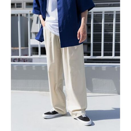 ナチュラルなツイル素材とウェビングベルトがポイントのストレートパンツは、軽やかな着用感でデイリーに使いやすい一本。