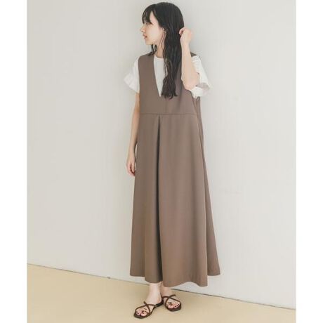 Vネックデザインがすっきりとした印象を与えるジャンパースカート。ハイウエストの切り替えが自然にスタイルアップを叶え、女性らしいシルエットを演出。インナー次第で表情が変わり、オンオフ問わず活躍する万能アイテム。シーズンレスで着回せるのも嬉しいポイントです。