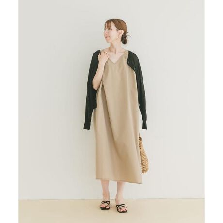 肩まわりにシャーリングを施した、Vネックデザインのノースリーブワンピース。身体のラインを拾わないストンと落ちるシルエットで、さらりと一枚で着ても様になる、頼れるアイテムです。ほどよい光沢感と落ち感のある素材で、シンプルながらも上品な印象に。シックなブラックと、やわらかな印象のベージュの2色展開です。