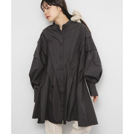 肩からウエストにかけて入った大きなタック仕様が存在感を放つミニワンピース。バックスタイルも施しているので、どこから見ても抜かりないデザインが魅力です。二の腕や腰回り、気になる箇所をカバーしてくれるサイジングになっており、着心地が良い綿を含む素材もポイントです。ボリュームがあるので、細身のボトムを穿き、さらっと羽織として着るとバランス良く仕上がります。前の釦を全て閉じミニワンピースとしても着用可能です。
