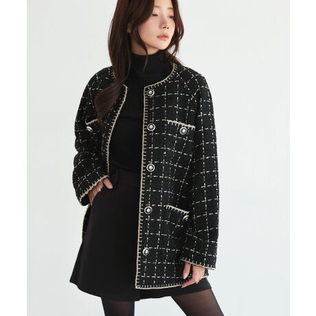 ラメを織り込んだツイードが華やぎを添えるノーカラージャケット