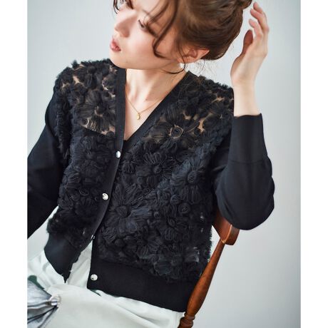 ふんわりと透け感のある身頃にフラワーモチーフのチュールをふんだんに施し立体的な素材感がポイントのカーディガン。