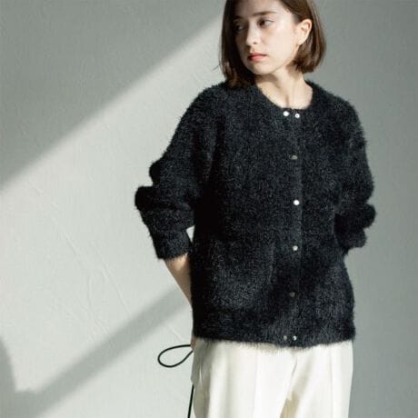 ・毛足感のあるシャギー糸とポリエステル糸をダブルフェイスで編み立てたニットカーディガン。