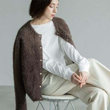 ・毛足感のあるシャギー糸とポリエステル糸をダブルフェイスで編み立てたニットカーディガン。