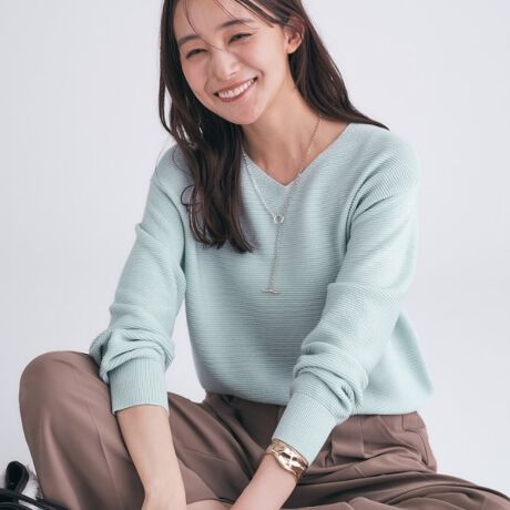 Vネックできちんと感がありながら、丸みのあるシルエットが女性らしい柔らかさをプラスしてくれるニットプルオーバー。