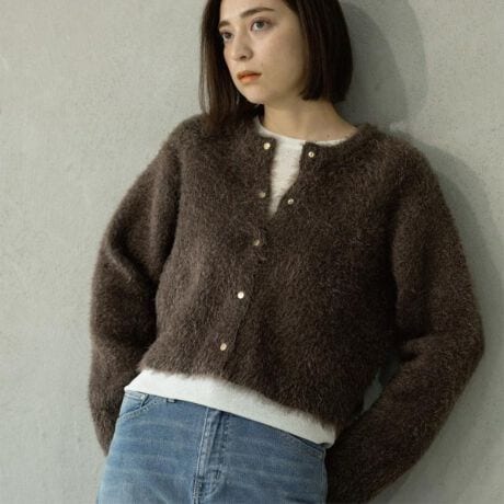 ・毛足感のあるシャギー糸とポリエステル糸をダブルフェイスで編み立てたニットカーディガン。
