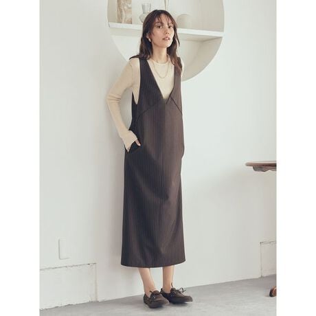 ワンピはシャープな切り替えラインがモードな印象。前から見ると深いVネック、後ろから見るとキャミワンピに見えるデザインです。