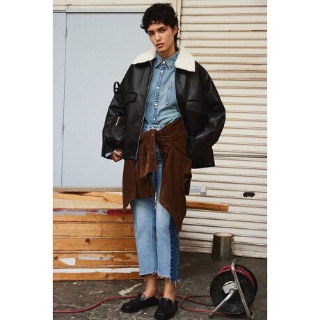 裾は「裾段差デニム」の特長である、フロントは短め、後ろは長めのスタイル。さらに前後にセンタープレスを入れて、脚長効果をプラスしています。