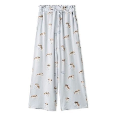 お気に入りの枕に寄り添う、リボンを付けたシーズー犬を描いたカットソーシリーズです。枕元でリラックスしたり、つぶらな瞳でこちらを見ていたり、色々な表情のシーズーを総柄プリントしたロングパンツ。タックインして着こなしやすいフリル付きのウエストで、両脇と右ヒップにはポケットが付いています。同シリーズのパンツや雑貨、同時期に展開するシーズーのニットプルオーバーと合わせてお楽しみください。