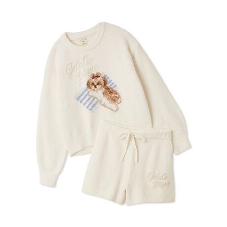 お気に入りの枕に寄り添うシーズー犬に癒される、ジャガードニットのシリーズです。ふんわりした風合いの絵柄に、ぷっくり立体的なロゴをあしらったプルオーバーとショートパンツのセットアイテムです。リボンを付けたシーズーの絵柄は、ボディの配色によって枕の柄が異なるのもポイント。オフホワイトとブルーは枕がストライプ柄、ネイビーは枕がハート柄になっています。シーズー好きの方へのギフトにもおすすめのアイテムです。