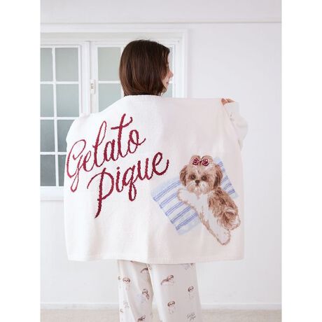 お気に入りの枕に寄り添うシーズー犬に癒される、ジャガードニットのシリーズです。ふんわりした風合いの絵柄に、ロゴジャガードをあしらったブランケット。デスクワーク時の膝掛けや肌寒いときの肩掛けにちょうど良い、コンパクトなサイズ感で仕上げました。同シリーズのウェアとコーディネートしたり、シーズー好きの方へのギフトにもおすすめのアイテムです。