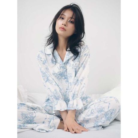 なめらかさ際立つ着心地の良いカットソーに、リボンとフラワーをミックスしたトワル・ド・ジュイ柄をプリントした開襟シャツ。