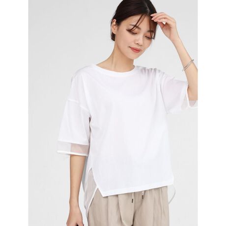 袖口と裾にチュール素材をドッキングしたデザインTシャツ。