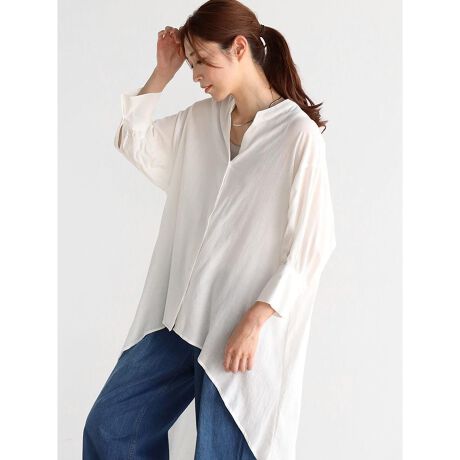 前後差のあるヘムデザインが、こなれた雰囲気を演出するロングブラウス。