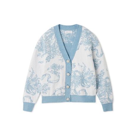 リボンとフラワーを合わせたロマンティックなトワル・ド・ジュイ柄をあしらった、ふっくらと柔らかな風合いのジャガードカーディガン。