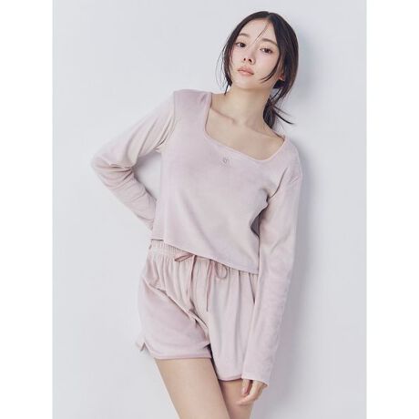 スクエアネックのトップスとショートパンツを組み合わせた、コンパクトなサイズ感のセットアップ。
