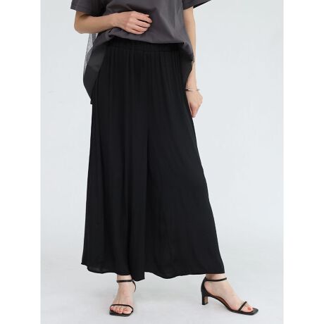 ツヤ感のあるキレイめな素材を使用した、リラックスムード漂うワイドパンツ。