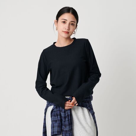 すっきりとした身幅で一枚着としてはもちろん、カーディガンやジャケットのインナーとしても着やすくオンオフ幅広く活躍します。