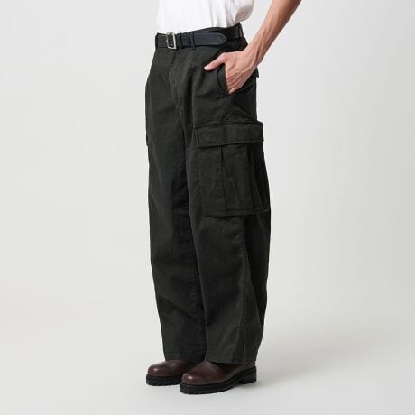 しっかりとした質感のチノをベースに、表面にピグメントプリントを施し洗い加工で退色感を出しています。