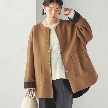 セミ 梳毛 配色 リバーシブル ノーカラー ショート コート
