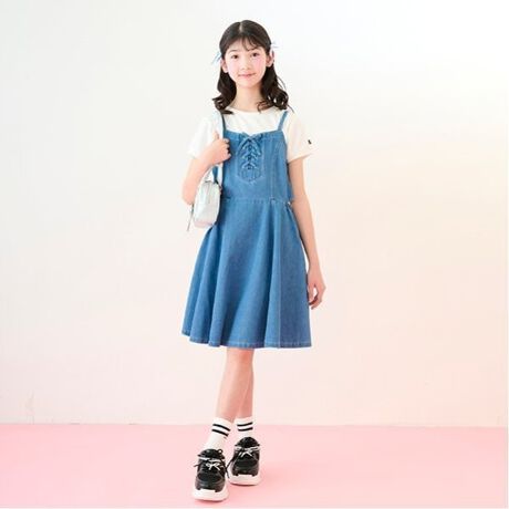 薄手のデニム生地にレースアップをほどこしたデザインが可愛らしいジャンパースカートとTシャツのセットです。