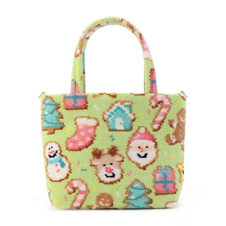 『クリスマスクッキーズ』のバッグです。サンタさんやトナカイ、ツリー、プレゼントなど、クリスマスモチーフのアイシングクッキーをたくさん散りばめました。カラフルな色彩で楽しい雰囲気を表現しました。内側にドット柄の生地を採用しているのもかわいいポイント。間口のサイドにはD管を配し、ショルダーベルトの取り付けも可能です。