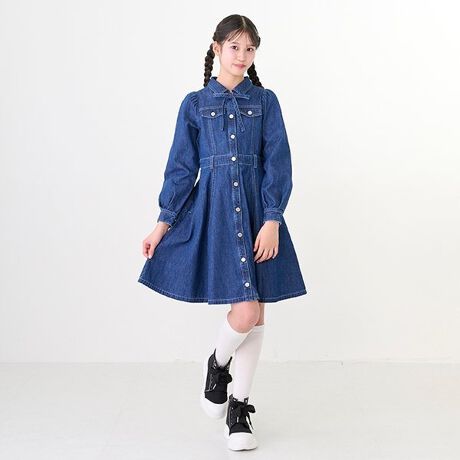 パフスリーブのお袖とフィット&フレアのシルエットでスタイルアップ見えが叶うデニムワンピースです。