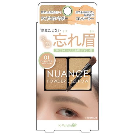 【01 肌に自然に溶け込む使いやすいマイルドブラウン】際立たせない「淡色忘れ眉」をつくるアイブロウパレット。薄くてふわっとした主張しすぎない眉に。パウダー:ぼてっとならない!ふわっと薄づきパウダー。アイシャドウ発想のやわらかくふんわりと発色するパウダー。コンシーラー:眉印象を弱める&輪郭修正に特化したコンシーラー。固めなテクスチャーと肌色になじむ色で、眉まわりへの気になるポイント隠しや輪郭修正が簡単。