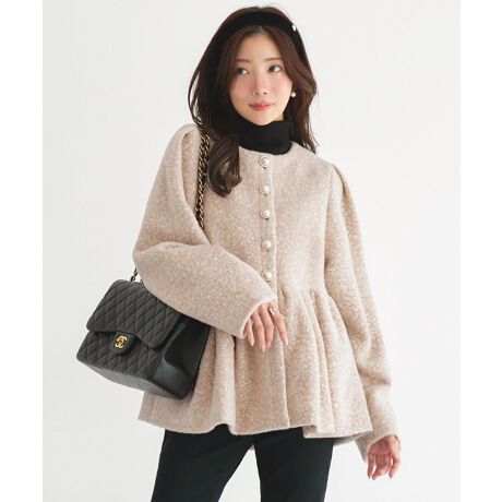ニュアンスカラーのソフトタッチボアと、パールボタンを使用し、カジュアルなボアコートを、キレイめにモダナイズ。