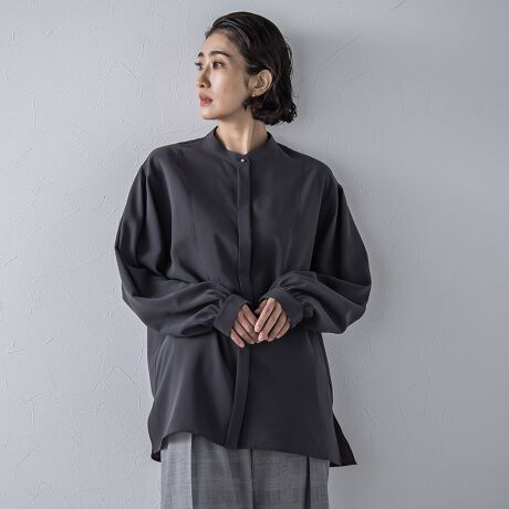 フロントヨークが程よいアクセントになった、バンドカラーデザインの長袖シャツ。