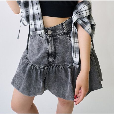 デニム生地とバルーンシルエットの組み合わせが魅力的なスカートです。