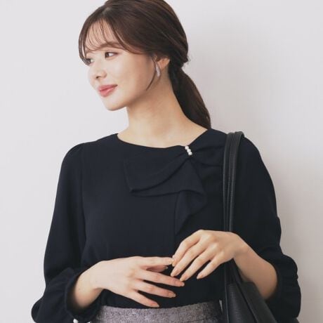 ・エレガントなパール調があしらわれたリボン風のフリルがアクセントの、洗練されたブラウス。