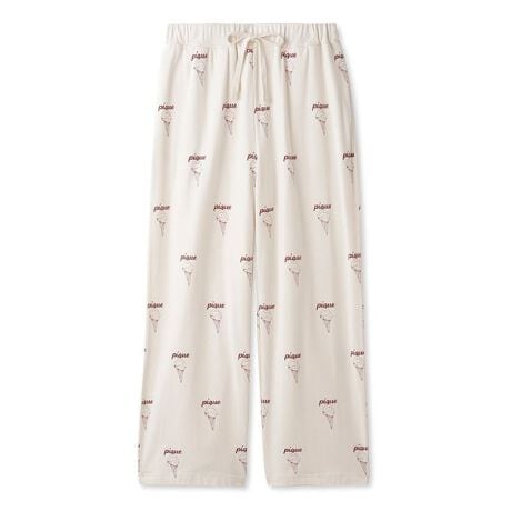 人気のアイテムがリバイバルで再登場しました。柔らかくなめらかなカットソーに、ラフなタッチで描かれたアイスクリームと、ふんわりベアの絵柄を総柄プリントしたUNISEXで着用が可能なロングパンツです。ヒップ周りをゆったり設計したストレートシルエットと、キュートな配色にもこだわりました。色はアイスクリームの絵柄が入ったアイボリーと、ベアの絵柄が入ったオフホワイト、ネイビーの3色です。同シリーズのロングTシャツとコーディネートしてお楽しみください。