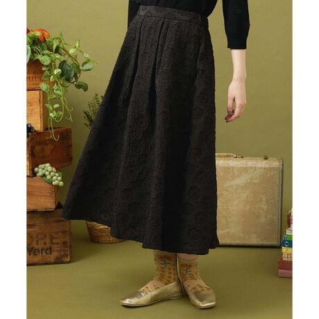 ぽこぽこしたお花の織柄が目を惹くスカート。フロントにタックを施し、ハリ感を活かしたふんわりシルエットが魅力。後ろウエストはゴム仕様できれい見えながらもリラクシーな着用感を叶えます。嬉しいポケット付き。ワントーンで立体的な花柄×シボ感のある生地の上品な印象のひと品です。