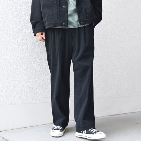 若干テーパードさせた美しいシルエットの2タックデザインにしたセミワイド型イージーパンツ。