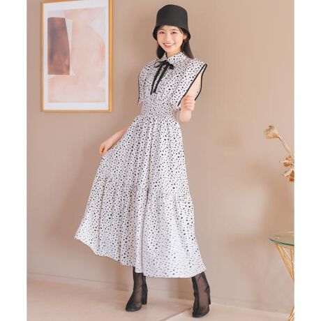 アクセントのダルメシアン柄が映えるフリルティアードワンピース 【Design】・アクセントになるダルメシアン柄を取り入れた個性あふれるワンピース♪・WILLSELECTIONらしいフェミニンなディテールを詰め込み、大胆な模様で軽やかな印象を演出!・パイピングフリルが程よい華やかさをプラスし、女性らしい印象に仕上げてくれます。・リボンデザインで可愛さも忘れず、甘さとモードの絶妙なバランスが魅力です◎・ティアードシルエットで動きに合わせてふんわりと揺れるのもポイント!・ウエストはシャーリング仕様で、着心地も抜群◎・前開きのフロントボタンで着脱も簡単。・取り外し可能なリボンタイ付きでアレンジも可能です。・いつでも気軽にさらっと着られて、可愛さもバッチリなワンピースです♪ 【Fabric】・柔らかな軽い着心地の生地を使用。・スムースな裏地付き。・ご自宅でお手入れが出来るのも嬉しいポイント♪ 【Care】洗濯機洗い可能