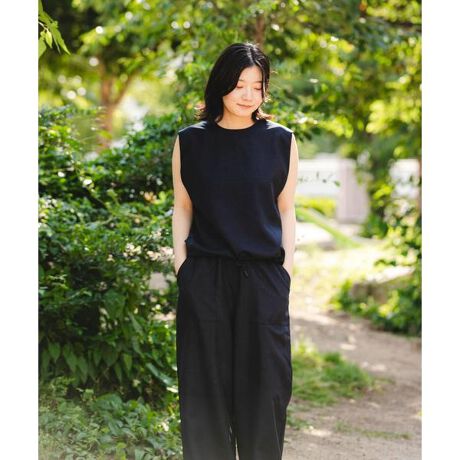 強撚の麻調ポリエステル素材は、さらっとして肌離れが良いので真夏まで活躍します。フレンチスリーブ程まで肩先があるスクエア型のデザインで、長袖や半そでと合わせでベストとしても、タンクトップやキャミソール合わせでノースリーブとして幅広く活用できます。後ろあきにはEKALロゴ入りプランサーを使用しています。裾のドロスト仕様とタックでシルエットを変えて楽しむこともできます。同素材のパンツと合わせてセットアップでき、サロペットのようにも着用可能です。杢調のシックなカラーで、カジュアル過ぎずに夏のアクティビティーシーンからタウンユースまで幅広く着用いただけます。